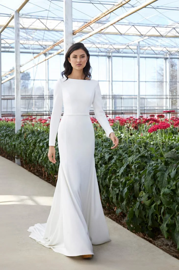 Samara, a distinctly modern wedding dress, features a clean cut, sophisticated look. This design is defined by its all white styling with high boat neck, and long sleeves. Fitted to the thigh, the dress continues into a classic fit and flare skirt.
