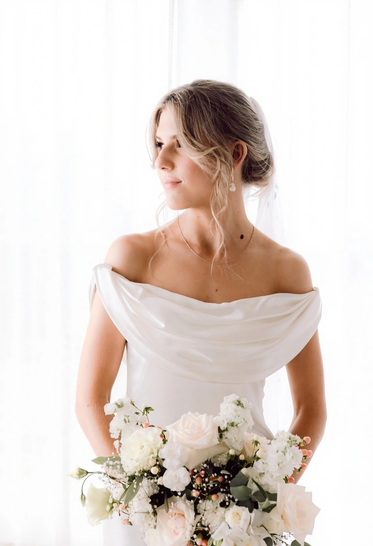 When Camryn came in for her consultation, she already had a clear direction. She was looking for a silk custom wedding dress that felt sleek, glossy, and defined by a dramatic draped collar. We developed the design in high gloss crepe backed silk satin in off white. The fabric gives a beautiful sheen, but is sensitive to handling, so the process required precision at every stage. The collar became the focus. Achieving the right structure and fall took careful development, as the drape needed to sit securely while maintaining a soft line. A fine silicone elastic was added to hold the neckline in place without disrupting the form. Through fittings, the proportions were refined until the silhouette felt resolved. The result is a silk custom wedding dress with a defined neckline and controlled drape. In Camryn’s words: