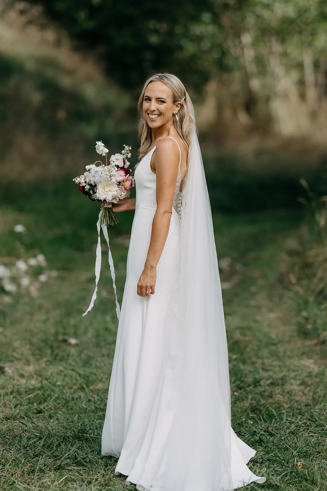 When Rachel came to see me, she had a clear direction for her wedding dress. Based in Auckland, she was happy to plan ahead for fittings and have a gown custom made, having been referred by a former bride. Her starting point was a simple sheath wedding dress with a sheer low lace back she had seen and loved, fine shoestring straps, and a clean V-neckline bodice. These elements formed the basis of the design. When trying on our collection, Rachel found she preferred a closer fit through the body and chose one of our fit-and-flare skirts. The design was refined to balance her original ideas with the silhouette that suited her best. Her gown was cut in French crepe, paired with delicate lace through the back. A row of covered buttons added structure and detail, while the overall look remained clean and understated. In Rachel’s words: “I felt a million dollars in my dress. I absolutely loved it.”